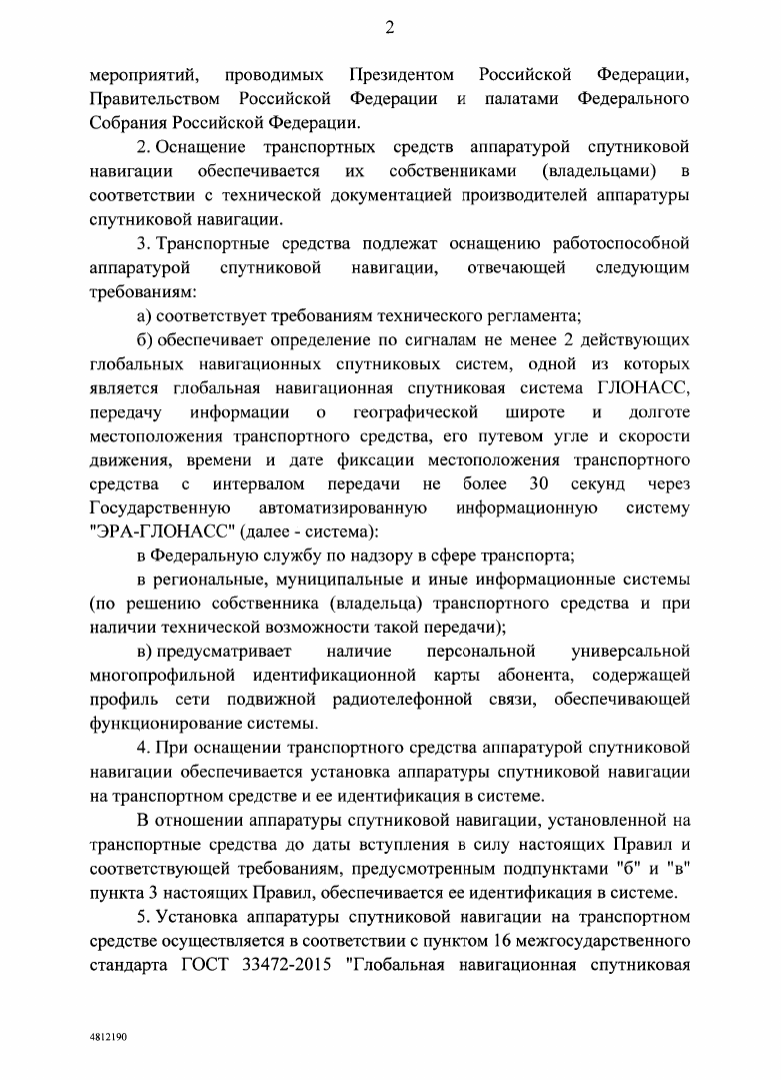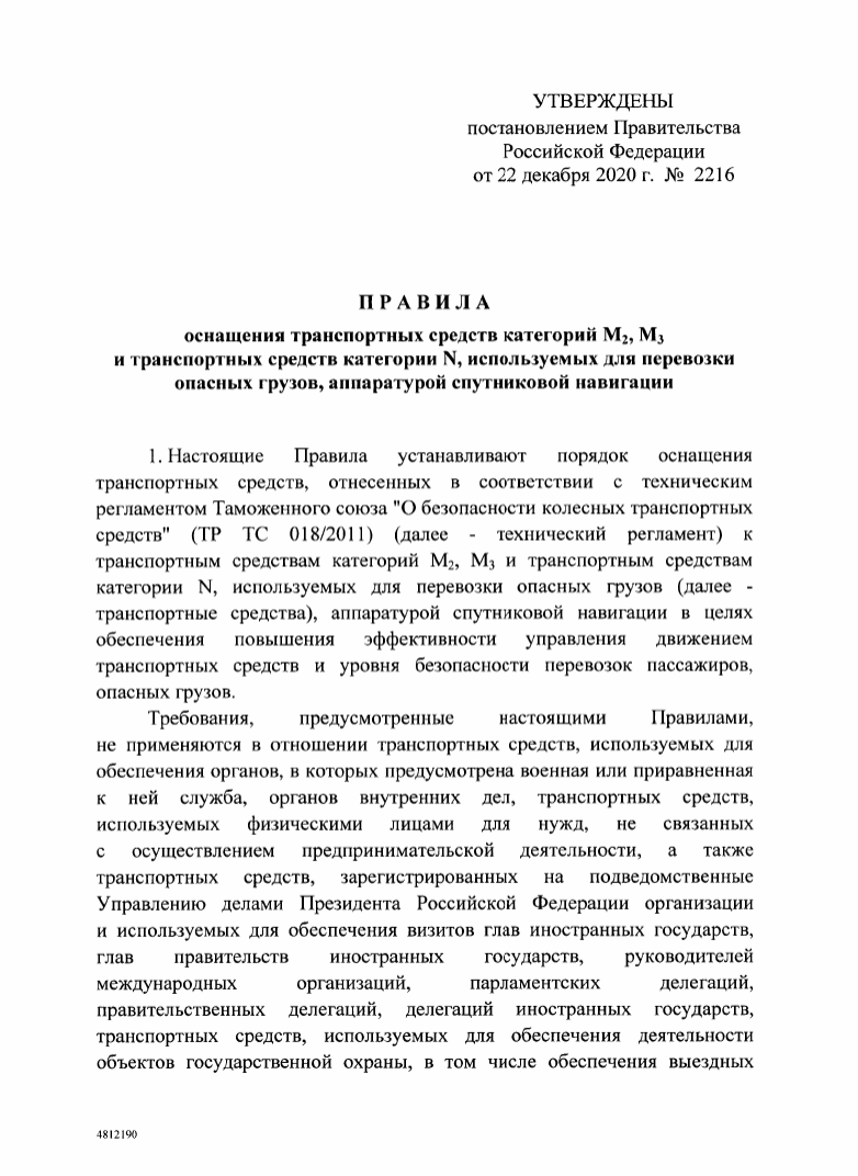 Постановлением Правительства Российской Федерации от 22.12.2020 № 2216 в целях обеспечения повышения эффективности управления движением транспортных средств и уровня безопасности перевозок пассажиров и опасных грузов утверждены новые Правила оснащения транспортных средств категорий М2, М3 и транспортных средств категории N, используемых для перевозки опасных грузов, аппаратурой спутниковой навигации